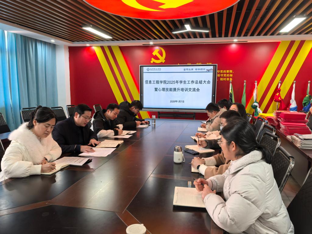 1月7日,信息工程学院组织召开2025年学生工作总结大会暨心理技能提升培训交流会,全面回顾过去一年学生工作取得的成效与经验,并就辅导员心理育人能力提升进行专题交流。学院党总支负责人、全体专兼职辅导员参加会议。